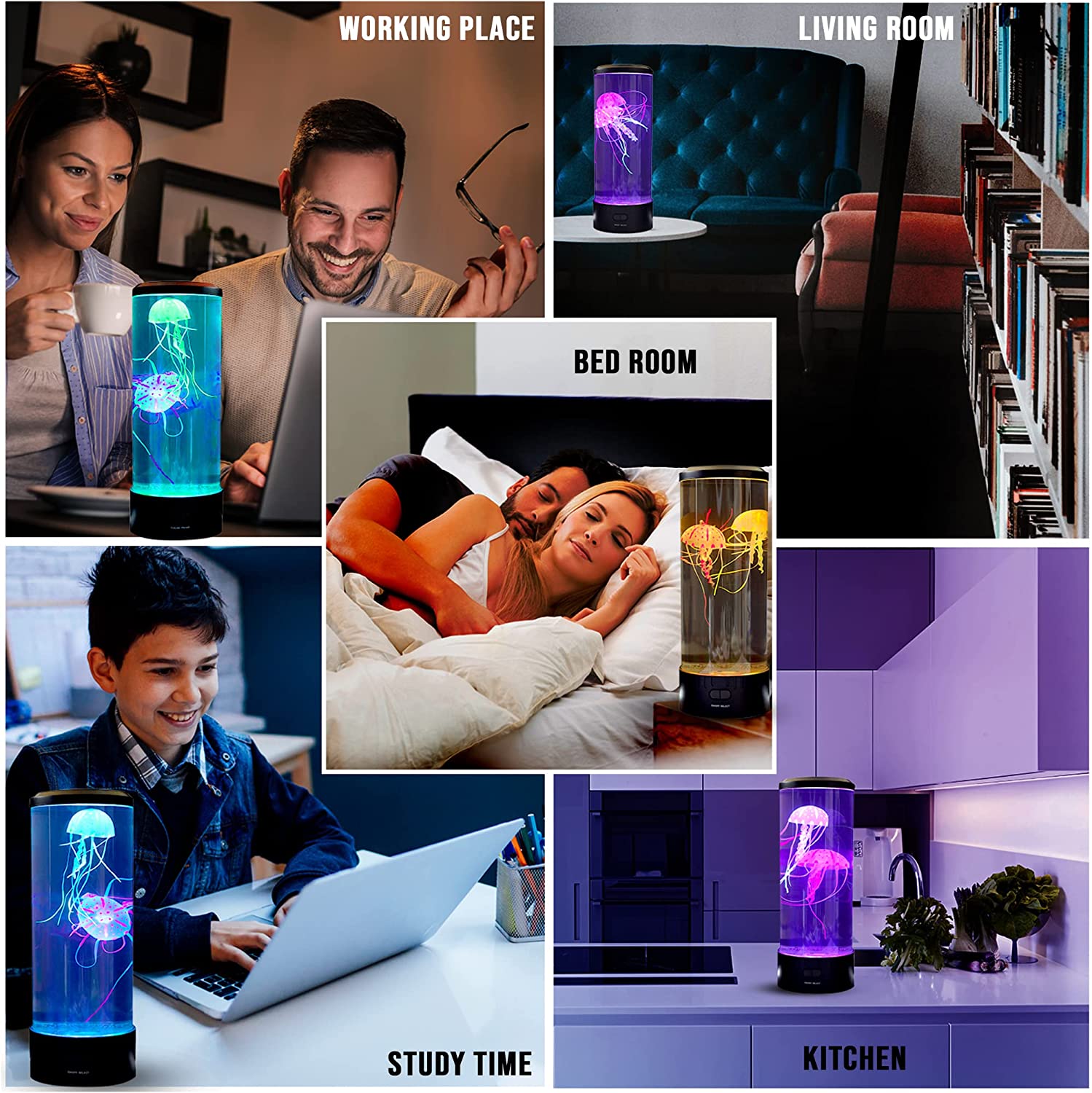 Fascinating Color changing effects. With quiet motor. The Lamp comes with 2 pcs life like synthetic Jellyfish with 18 LED lights (6pcs Red+6pcs Blue+6pcs Green).